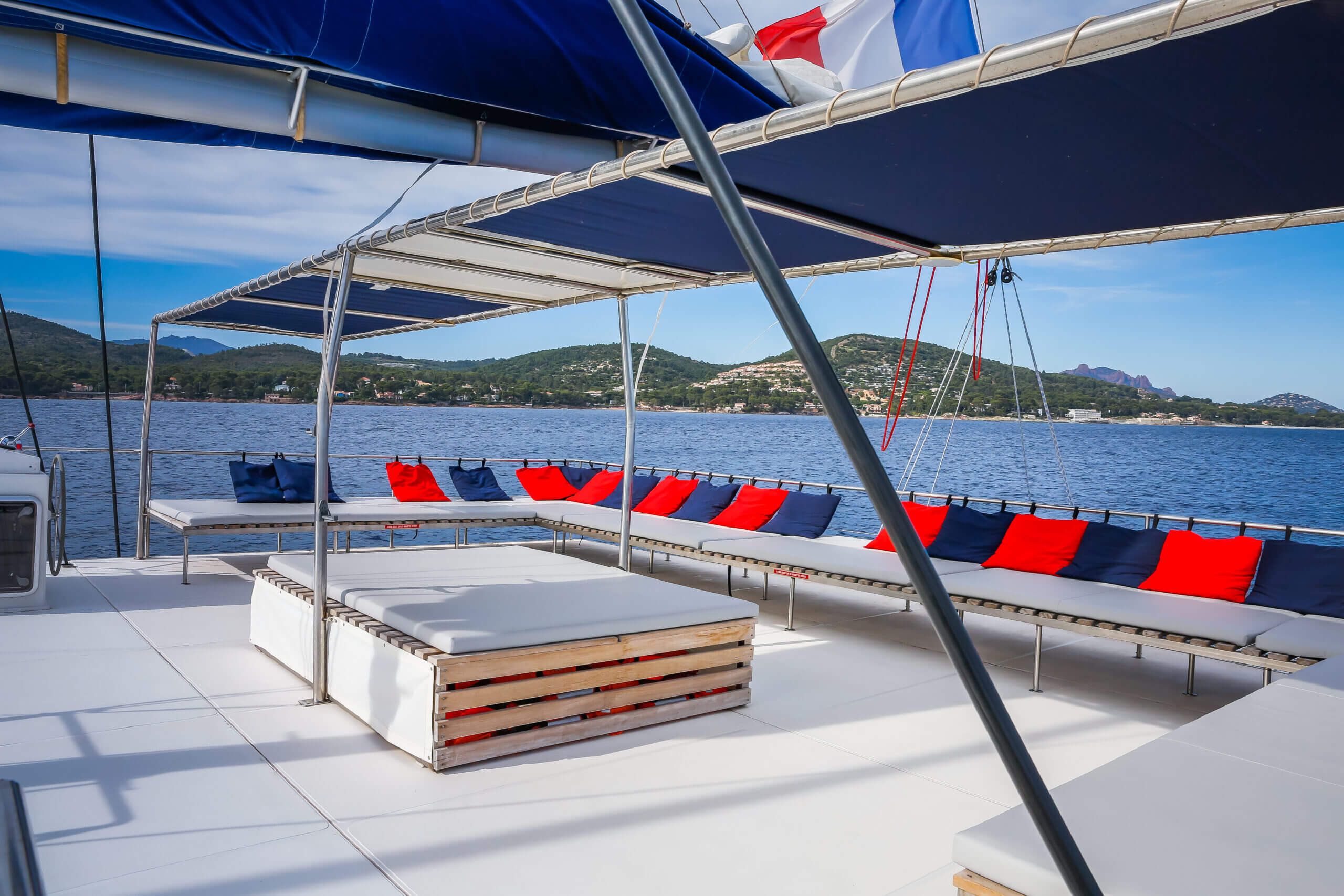 This full-day sailing trip will start at 10h00 and finish around 19h00. Our spacious sailing catamaran with una capacidad de 124 personas ofrece la posibilidad de sentarse o tumbarse en la red sobre el mar. Admirando el impresionante costa de Denia con su acantilados, cuevas, el castillo de Denia y montañas en el horizonte.