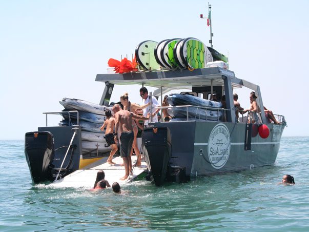 After a boat trip of about 40 minutes we will anchor and you have the choice of going out on the sea on a Kayak or SUP Board. Both sports are very easy to learn and a lot of fun! We have single and double kayaks available onboard, so you can choose whatever you prefer. There are 8 SUP Boards, and of course you can also go with two people on one board as well if you feel like it.