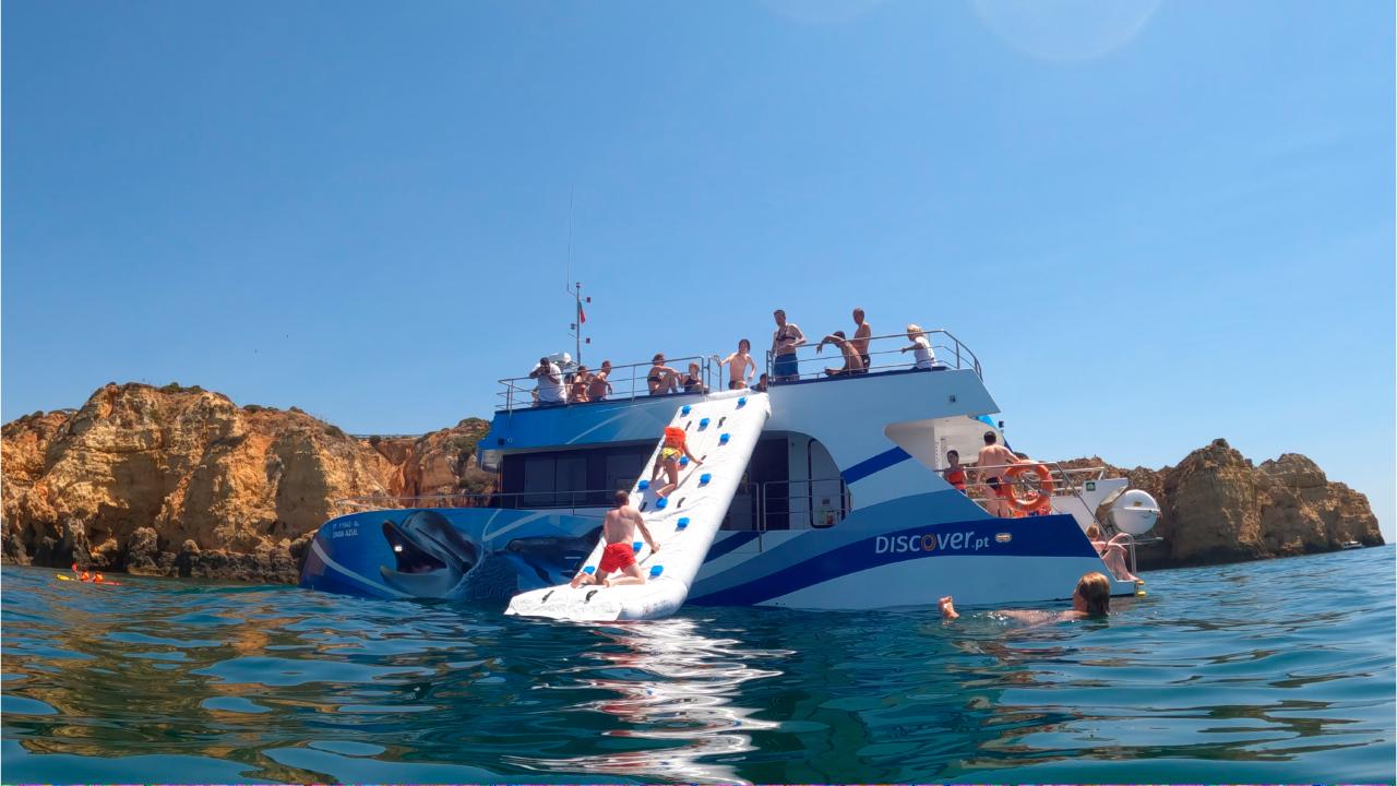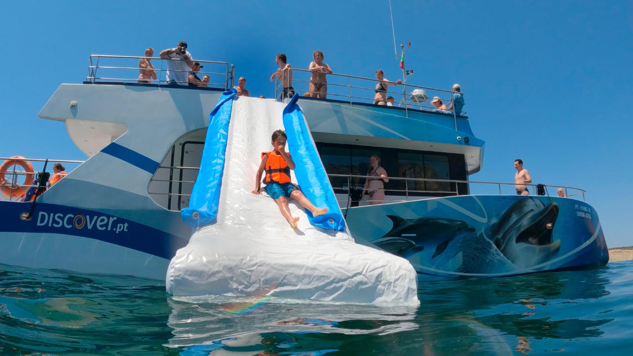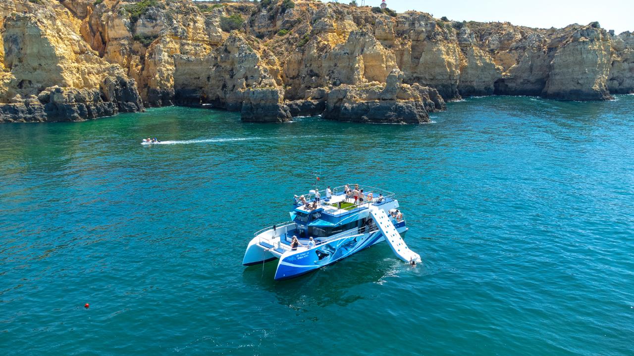 Your knowledgeable guides will share fascinating facts about the sea life, enhancing your dolphin watching on a Catamaran in Lagos experience. After meeting the dolphins, you’ll head to a secluded bay where you can swim, sunbathe, and slide into the water from the boat. This modern and new Power Catamaran offers comfort and fun for both kids and adults, making it the most comfortable and stable choice for families.
