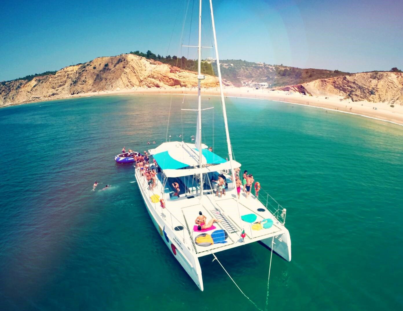 After the sightseeing portion, the coastal cruise in Lagos continues toward the quiet, protected bay of Praia da Luz. Here, the vessel drops anchor for a session of active fun. Guests have the chance to jump directly off the catamaran into the refreshing Atlantic Ocean. For those wanting to explore the calm waters further, the crew provides stand-up paddleboards (SUP) available on board for guest use.