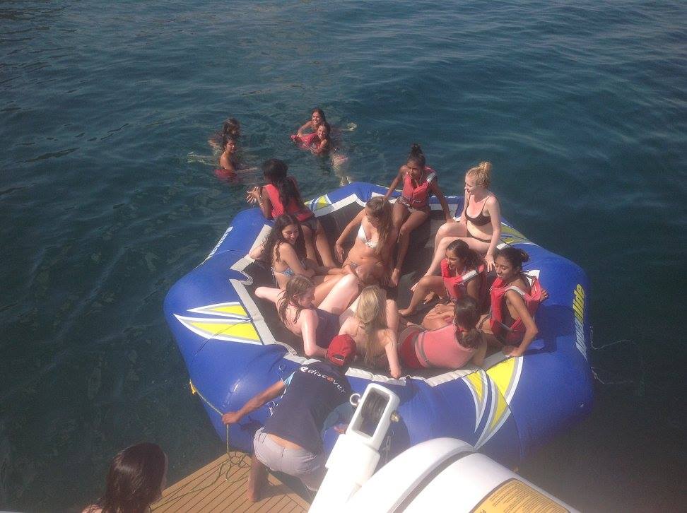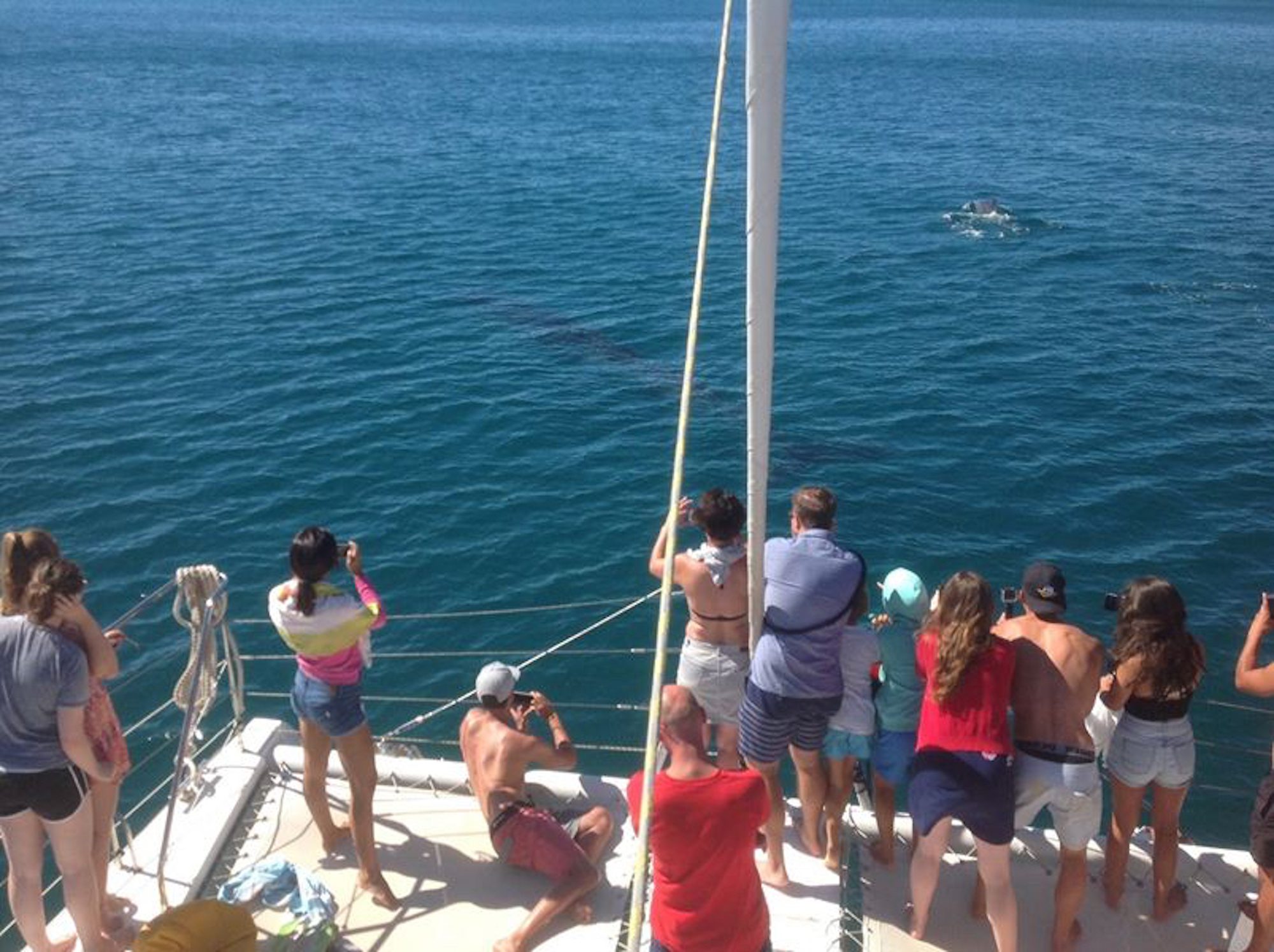 Following the swim stop, passengers can return to the deck and enjoy a selection of drinks or snacks available from the onboard bar. The boat then cruises smoothly back to the marina while guests relax in the sun.