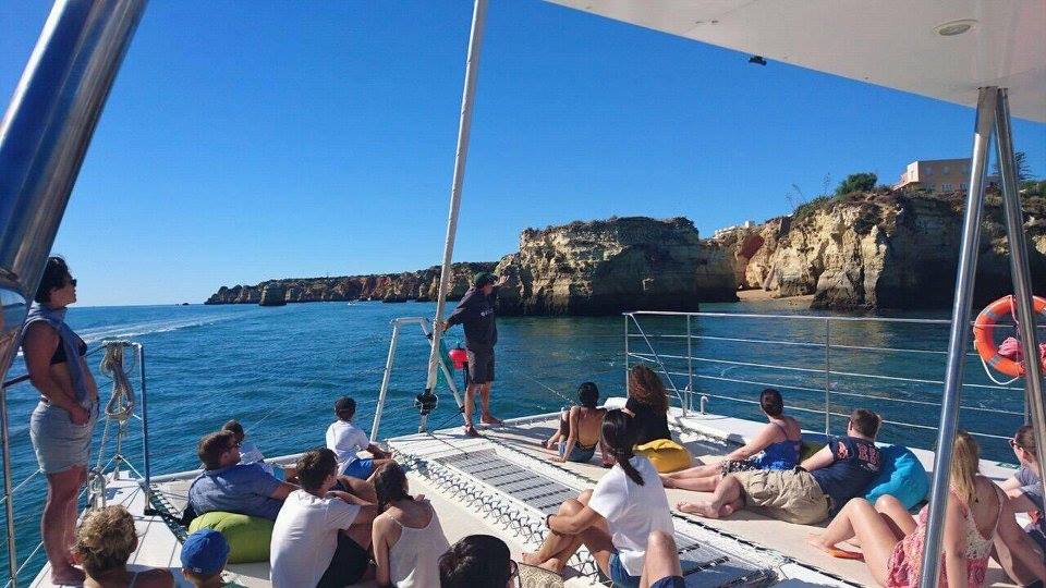 The journey begins at the lively Marina de Lagos. Passengers can find a spot on the spacious sun deck or stretch out on the comfortable sunbathing nets at the front of the boat. As the vessel sets sail, the warm sea breeze and panoramic views of the golden coastline create a peaceful atmosphere for all on board.