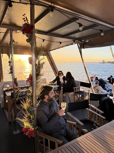 Come on board a stylish catamaran with a capacity for up to 40 people for the best New Year’s Eve Party in Lisbon! This NYE boat party starts at 23:00 at the meeting point Doca de Santo Amaro and returns here at 01:30. On board, you will find a beautiful setting with all the amenities you need for a perfect New Year’s Eve Cruise: an open bar with unlimited drinks, covered tables, heating and a bathroom.