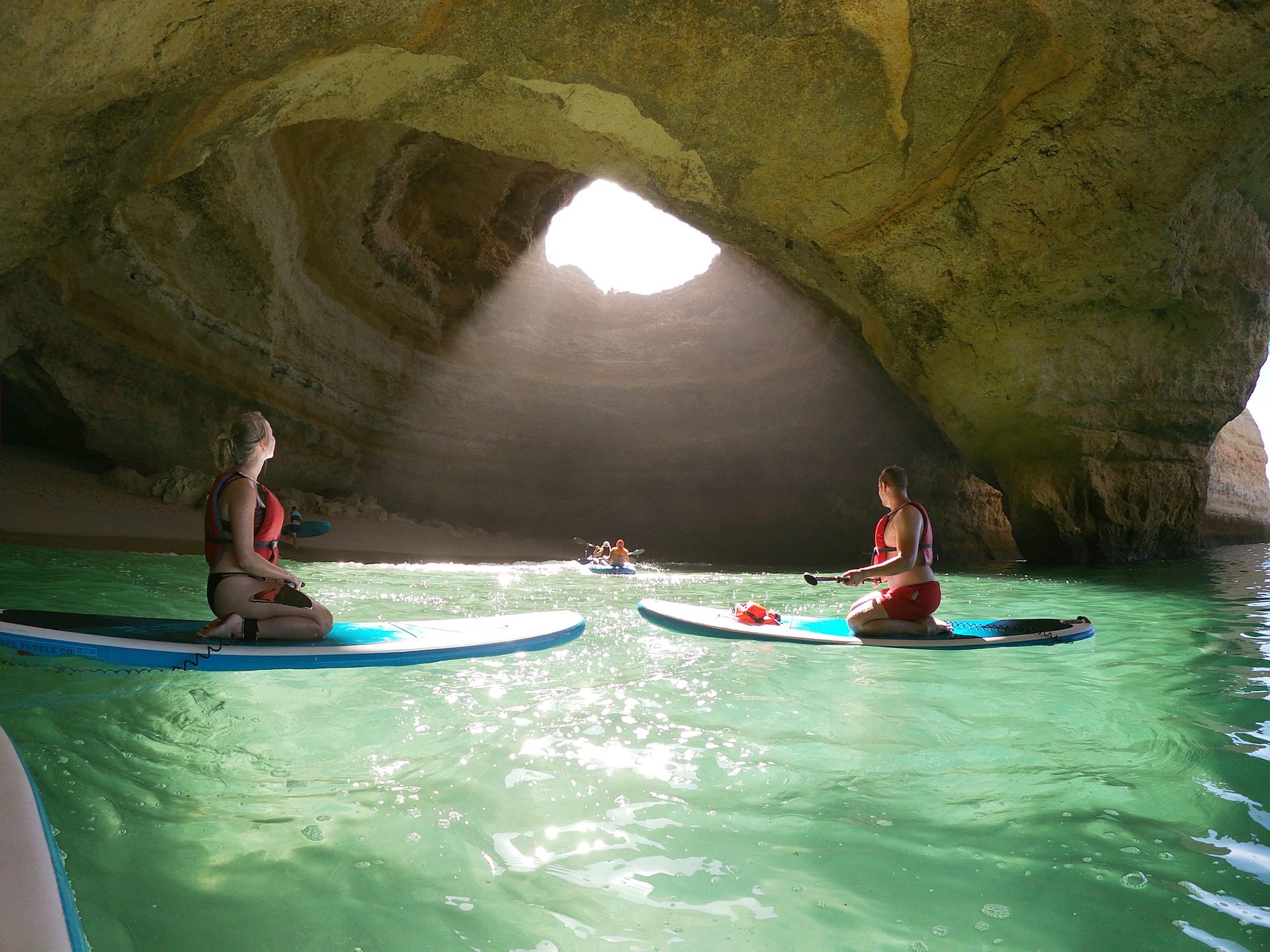 On this SUP tour in Benagil, while standing or sitting on your knees on your SUP board, you’ll be paddling along the impressive rock formations of Benagil. While standing or sitting on your board, you’ll experience the coastline from a unique perspective.