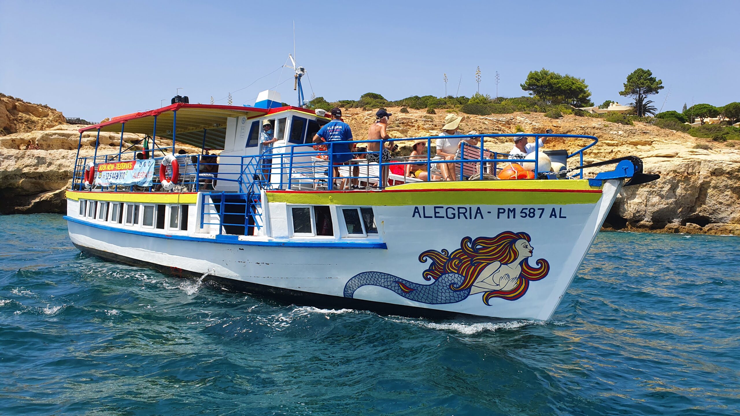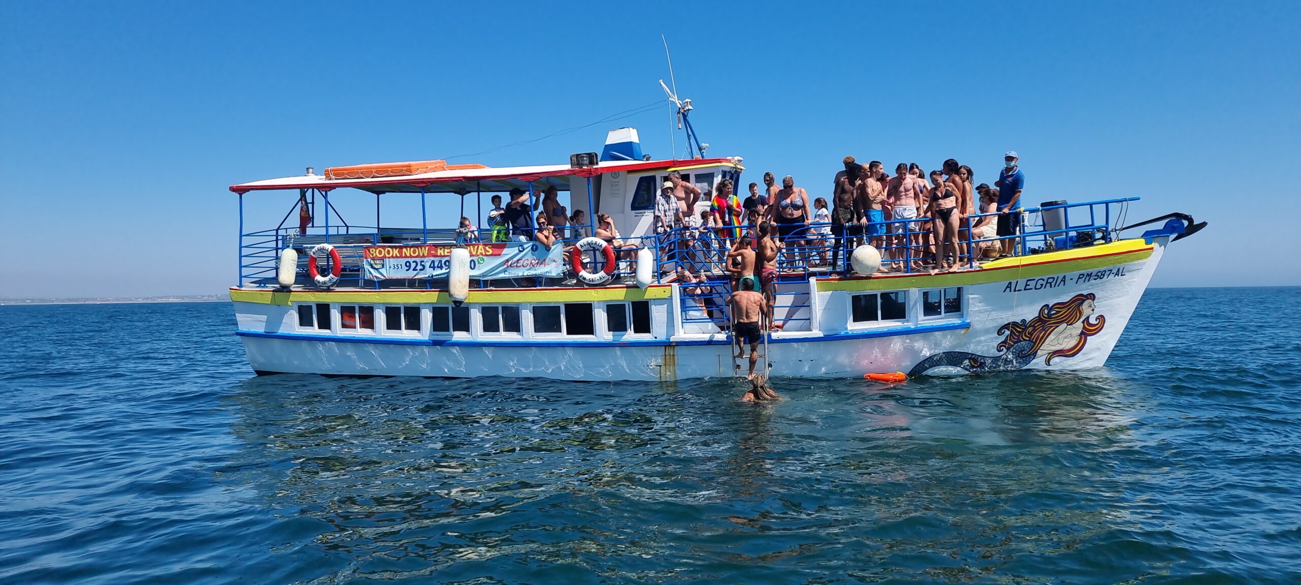 These boats are big enough (with capacity for 80 people) to take the whole family on an unforgettable trip. The boat has large areas, with sun and shade, and is ideal for calm trips. Near the Benagil cave there is a stop of about 10 minutes for swimming (not inside the cave). There is also a bathroom on board.