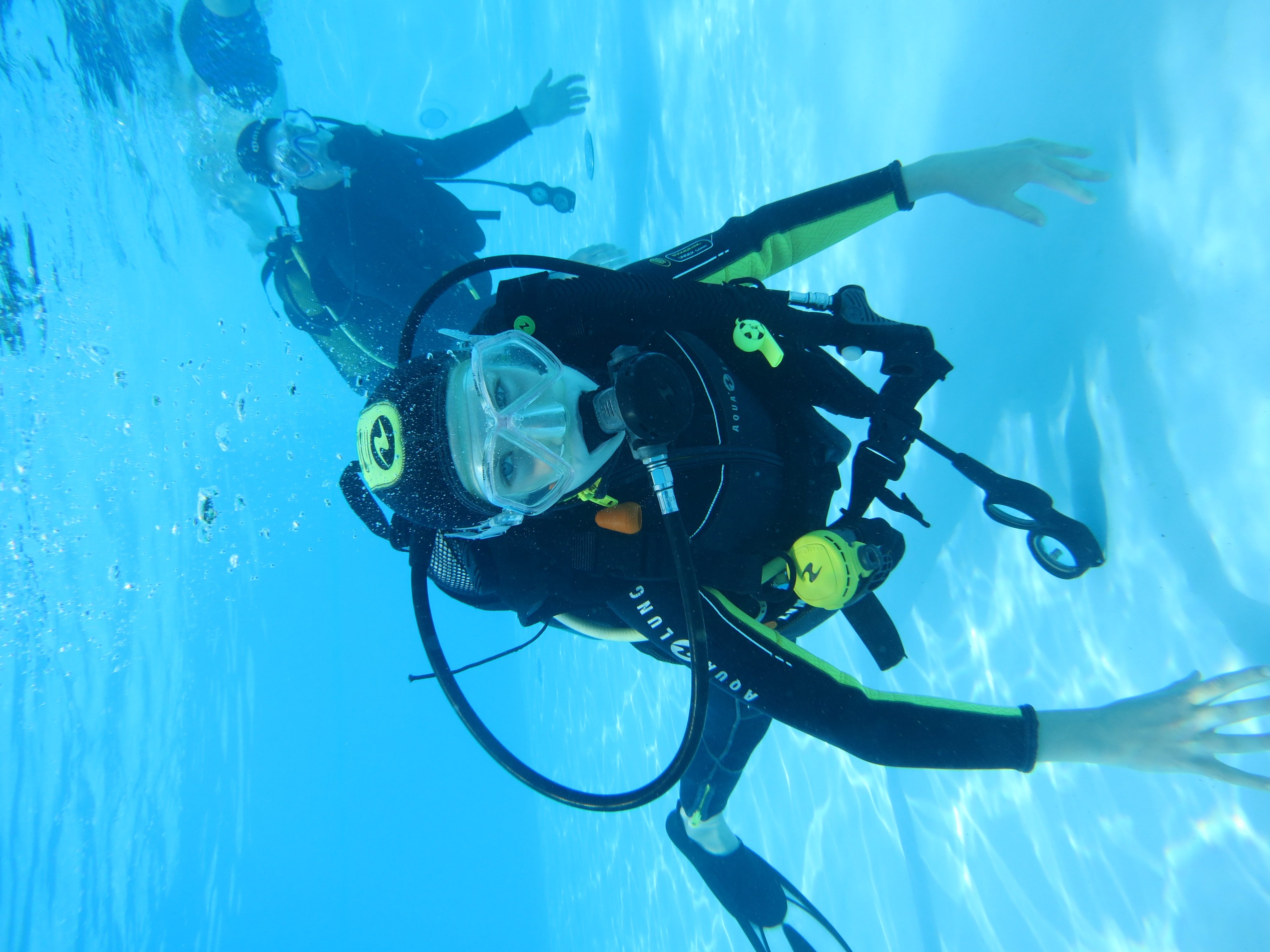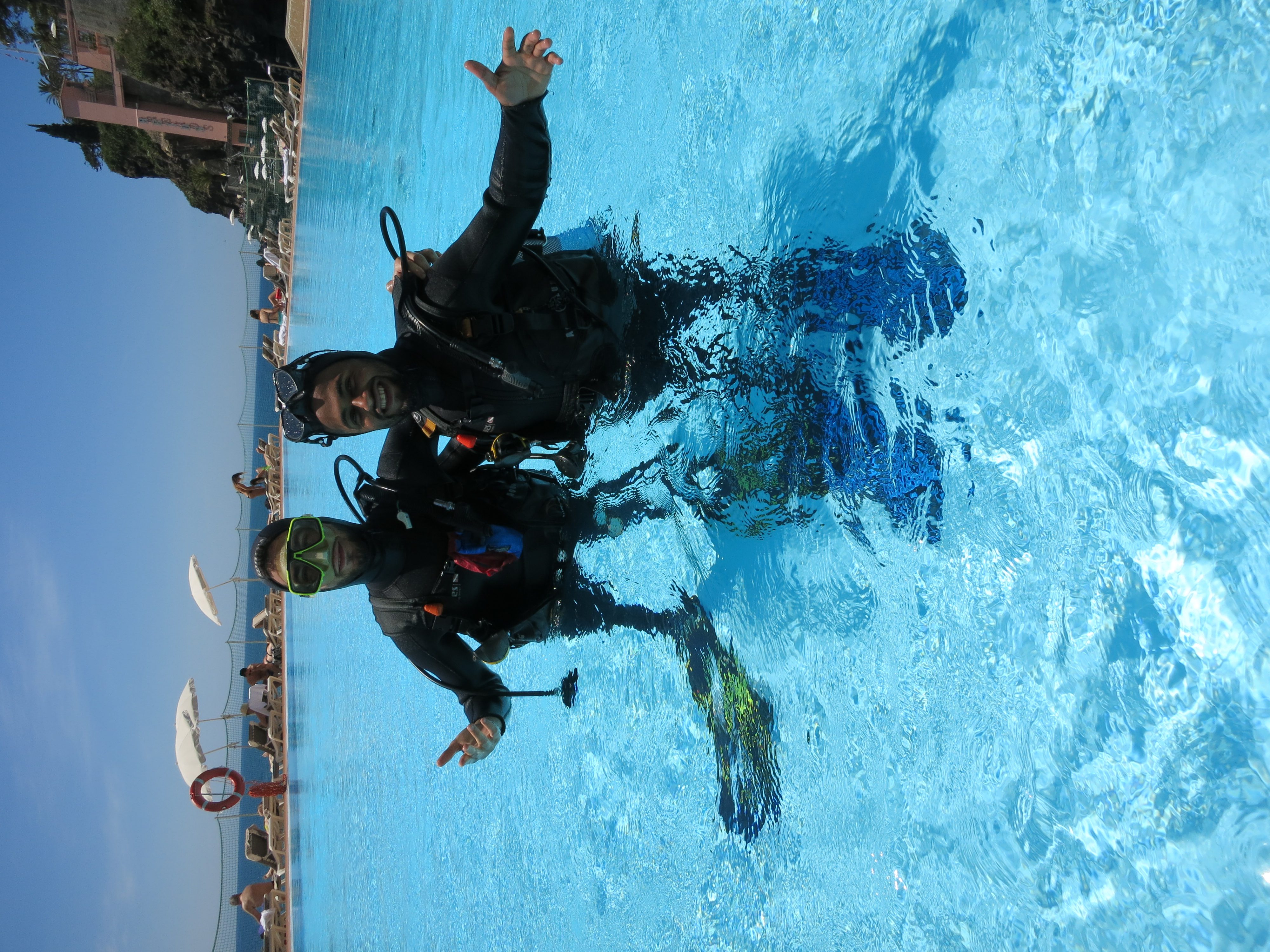 Assim que se sentir confiante, vamos para a água! Começamos numa área rasa e calma - normalmente numa baía protegida ou numa piscina - para praticar as suas primeiras respirações e competências básicas. O seu instrutor estará sempre ao seu lado para garantir que se sente seguro e relaxado.